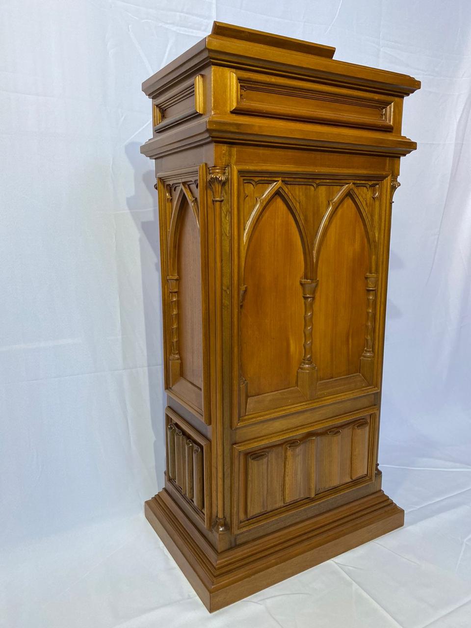 Com profundo respeito pela Arte Sacra e pela Estética Religiosa, cada peça é cuidadosamente desenhada para refletir a Beleza e a Solenidade dos ambientes sagrados. O Estilo Gótico, com seus Arcos Ogivais, Entalhes detalhados e formas imponentes, é trabalhado com excelência por artesãos experientes, garantindo móveis que transcendem o tempo.